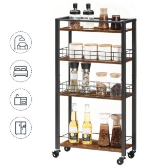 के साथ रसोई भंडारण कार्ट 4 स्तरों, देहाती भूरी और काली संकीर्ण सेवारत गाड़ी, पहियों पर औद्योगिक मसाला शेल्फ, बास्केट के साथ रसोई की गाड़ी, रसोई के लिए, स्नानघर, भोजन कक्ष, कपड़े धोने का कमरा
