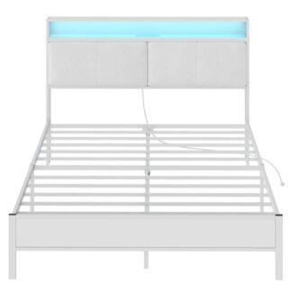 Bingkai tempat tidur queen putih, Bingkai tempat tidur platform logam dengan stasiun pengisian daya dan lampu LED, Headboard dengan rak, Tidak ada pegas kotak yang dibutuhkan