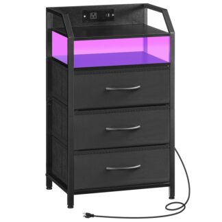 충전 스테이션이있는 검은 밤 스탠드, 침대 옆 테이블 1 AC 출구, 1 USB 포트, 그리고 1 Type-C 포트, LED 라이트 스트립이있는 야간 스탠드 및 3 짠 서랍, 침실을 위해
