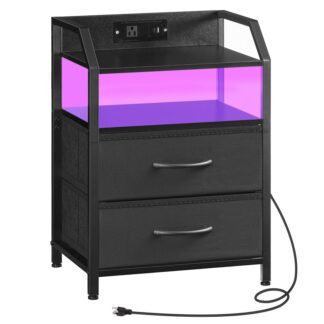 Black Nightstand with Charging Station, Bedside Table with 1 AC Outlet, 1 USB Port, and 1 Type-C Port, Night Stand with LED Light Strip and 2 Non-Woven Drawers, for Bedroom