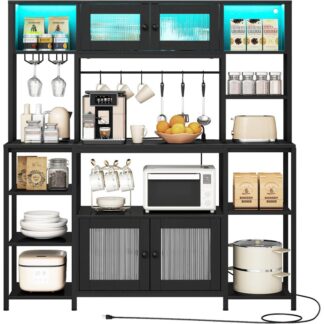 Black Bakers Rack with Power Outlet and LED Light, Industrial Microwave Stand, Coffee Bar Cabinet with Storage, Goblet Holder & 6-S Hooks, Kitchen Storage Shelf with Cabinet