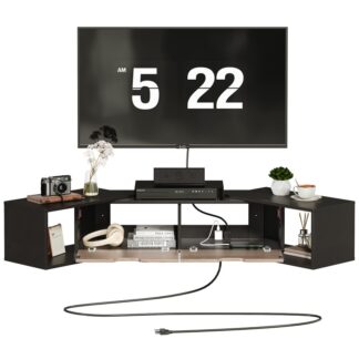 Floating Corner TV Stand with Power Outlet, Walnut and Black Rotatable Floating Entertainment Center, Wall Mounted Entertainment Center with Storage for Living Room, Under TV Shelf