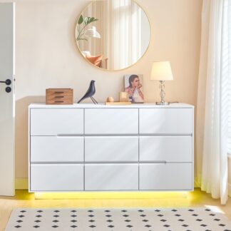 White Dresser for Bedroom, Handless 9 Drawers Dresser, 55'' Modern White Chest of Drawers with Charging Station and LED Light, Dressers Organizer for Bedroom, Living Room, Hallway